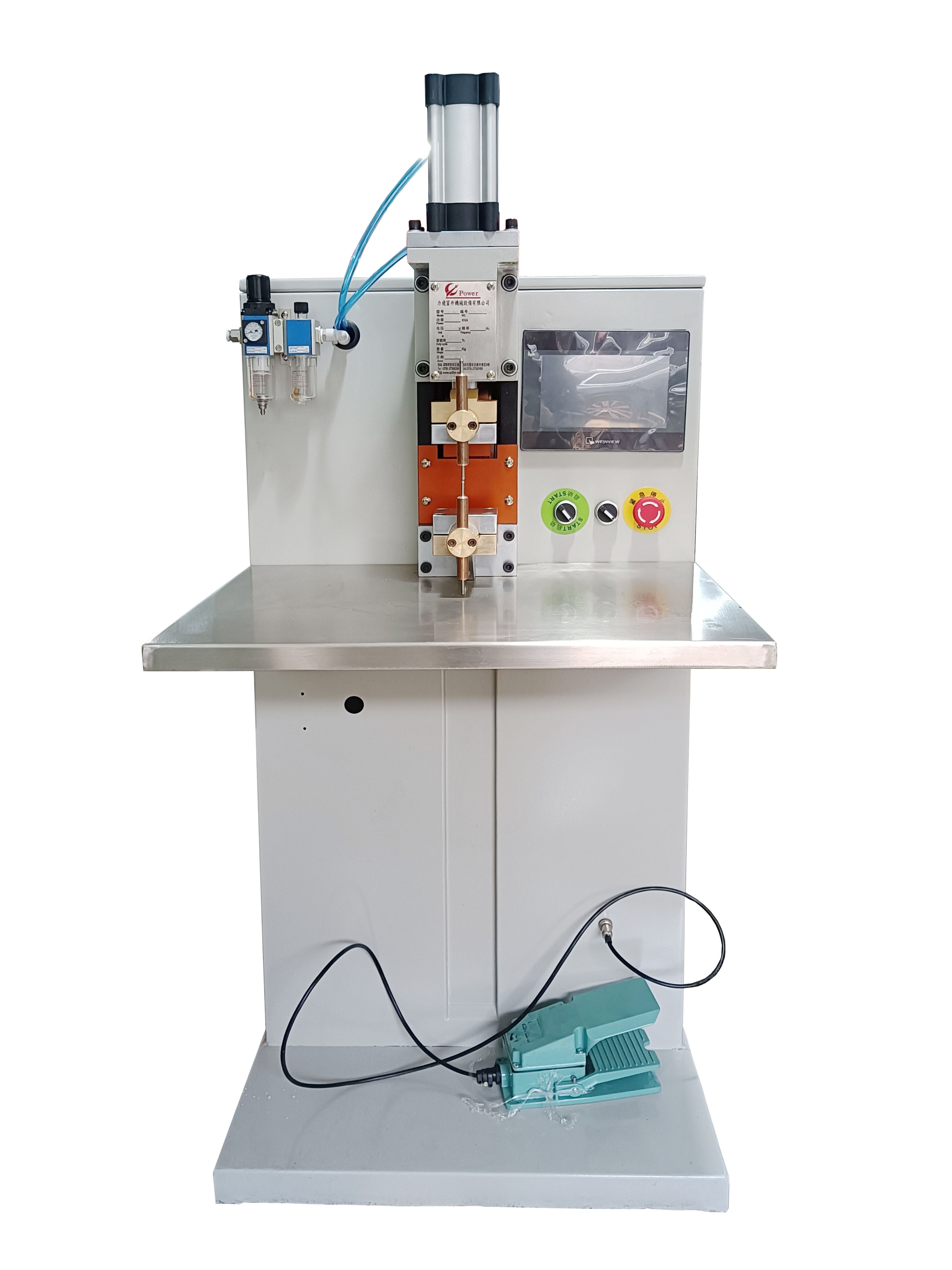 1,點焊機使用前,首先要調整好電極位置,使上下電極頭在一個軸心,這樣才能保證電流回路的形成,并在工件接觸面上順利形成焊點。